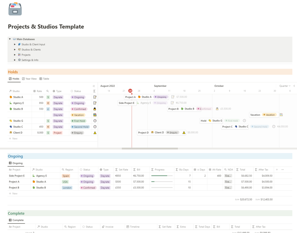 - a Clients & Studios database, and a Projects database. The Clients & Studios one serves the purpose of logging the studios and clients you work for, including properties for your point of contact, website, rate, region, and the currency they use.
